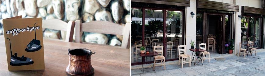 Ένα καφενείο αποτέλεσμα συλλογικής δουλειάς επτά ανθρώπων, οι οποίοι ένωσαν τις διαθέσεις τους, τις δυνατότητες τους και αποφάσισαν να διεκδικήσουν τα "προς το ζην" μακρυά από λογικές και σχέσεις εκμετάλλευσης , λειτουργώντας από κοινού χωρίς υπαλλήλους και αφεντικά. Το καφενείο "συγγρουόμενο" αποτελεί μια κοοπερατίβα, στην οποία προσπαθούμε να προσφέρουμε προϊόντα από μικρούς παραγωγούς με τους οποίους χτίζουμε σχέσεις εμπιστοσύνης χωρίς γραφειοκρατικές "πιστοποιήσεις" και μεσάζοντες.