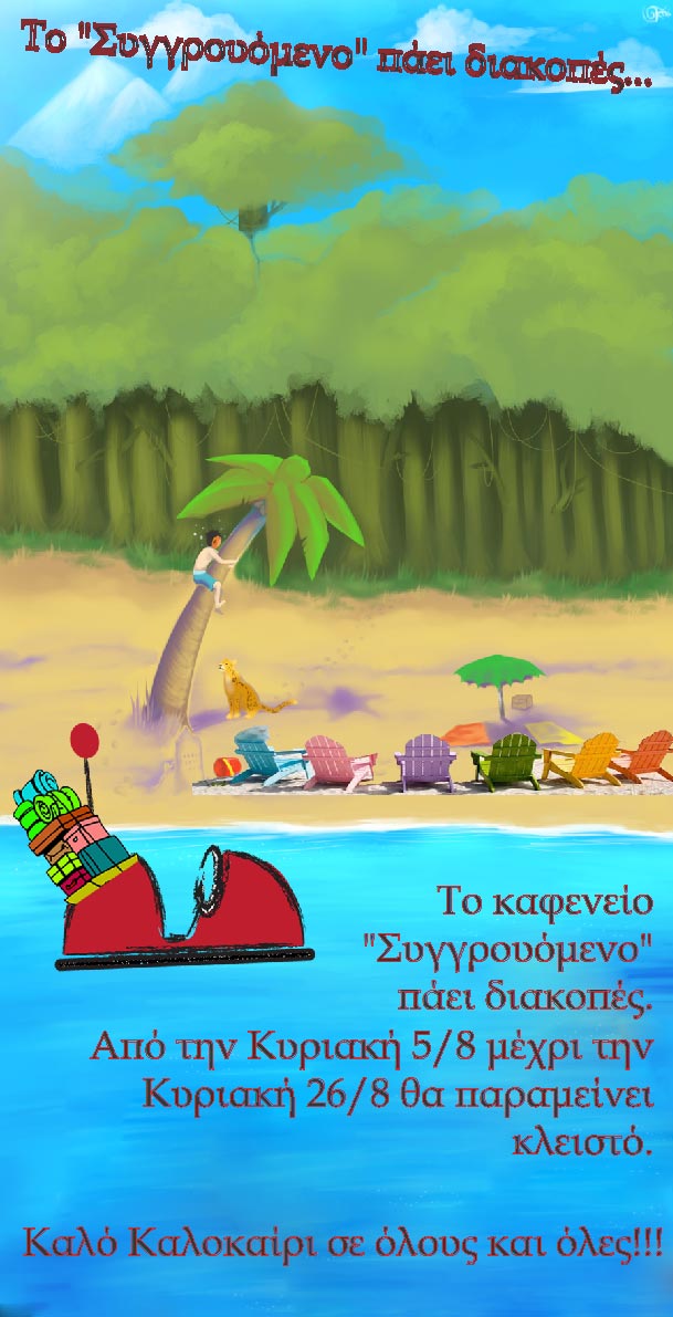 Το καφενείο "Συγγρουόμενο" πάει διακοπές. Από την Κυριακή 5/8 μέχρι την Κυριακή 26/8 θα παραμείνει κλειστό.